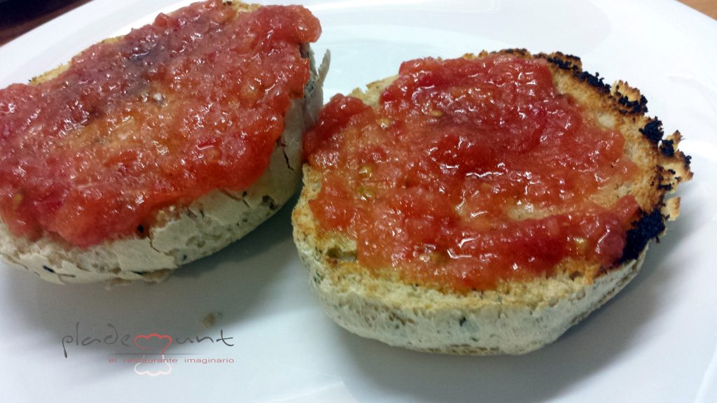 Mientras tanto en una sartén y a fuego tranquilo preparamos el tomate frito. Sofreímos el ajo y la cebolla en aceite de oliva virgen extra y luego añadimos el tomate rallado. Sal y azúcar para corregir la acidez. En los últimos minutos agregamos las hojas de albahaca rotas.