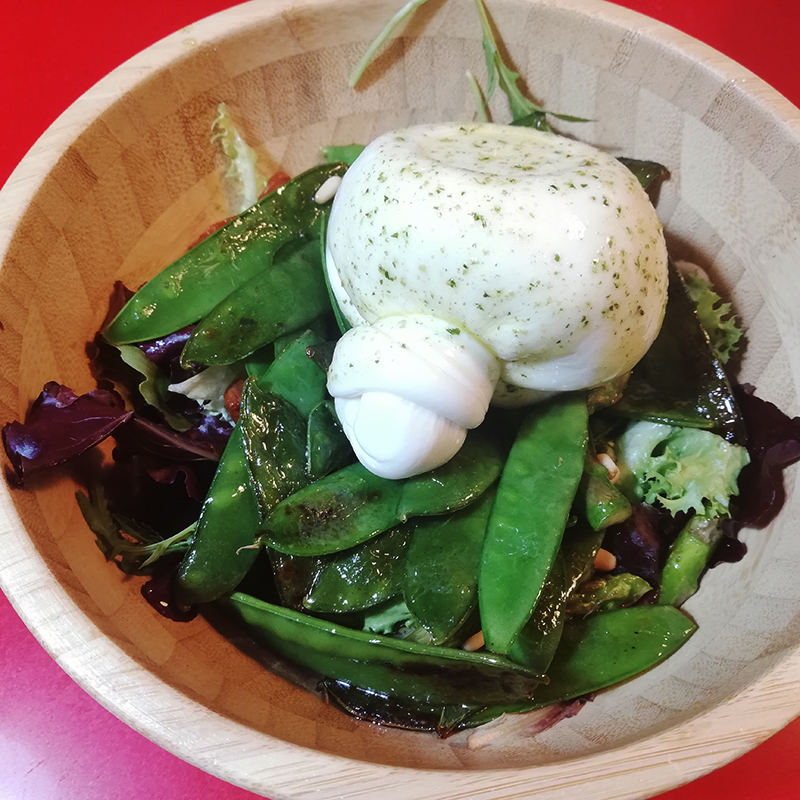 brotes tiernos, confit de pato, frutos secos y queso de cabra de la Cabezuela con una vinagreta de miel