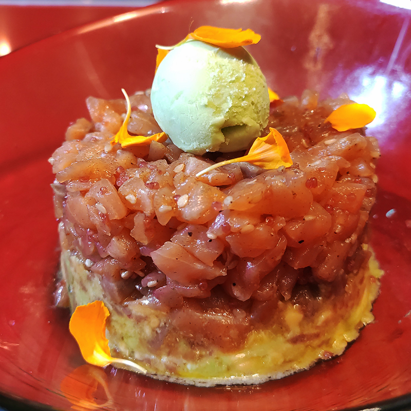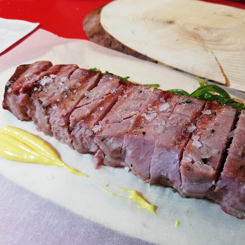 Lomo de atún rojo de Balfegó macerado ligeramente en soja y jengibre, braseado a la parrilla y acompañado con un pisto de tomates y mostaza. Sin gluten.