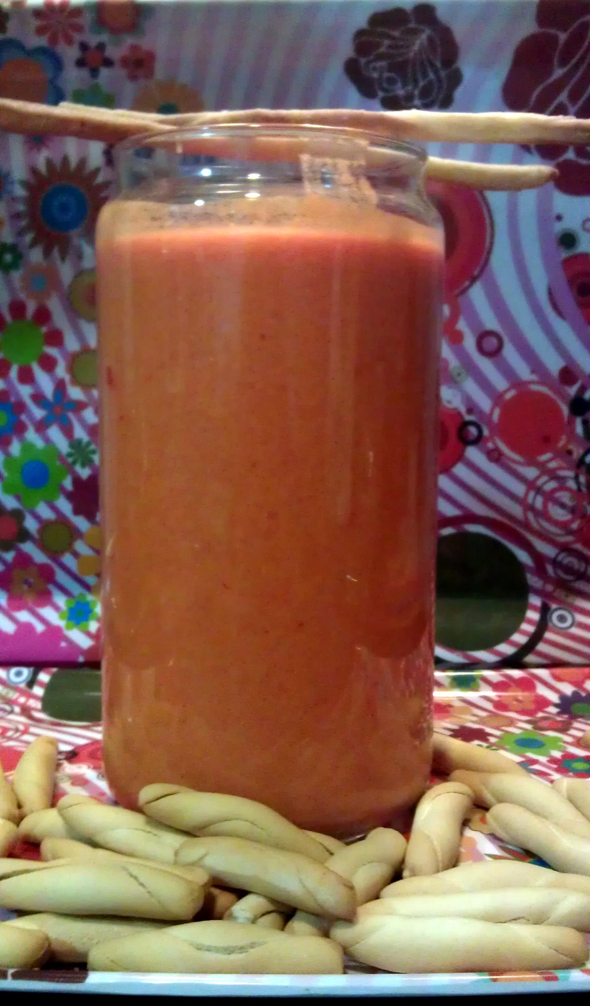 Pelamos el pimiento y los tomates. Colocamos todas las verduras, frutos secos y el resto de ingredientes en un recipiente alto y trituramos con la batidora eléctrica hasta conseguir una cema más o menos espesa. Comprobamos el punto de sal y pimienta.