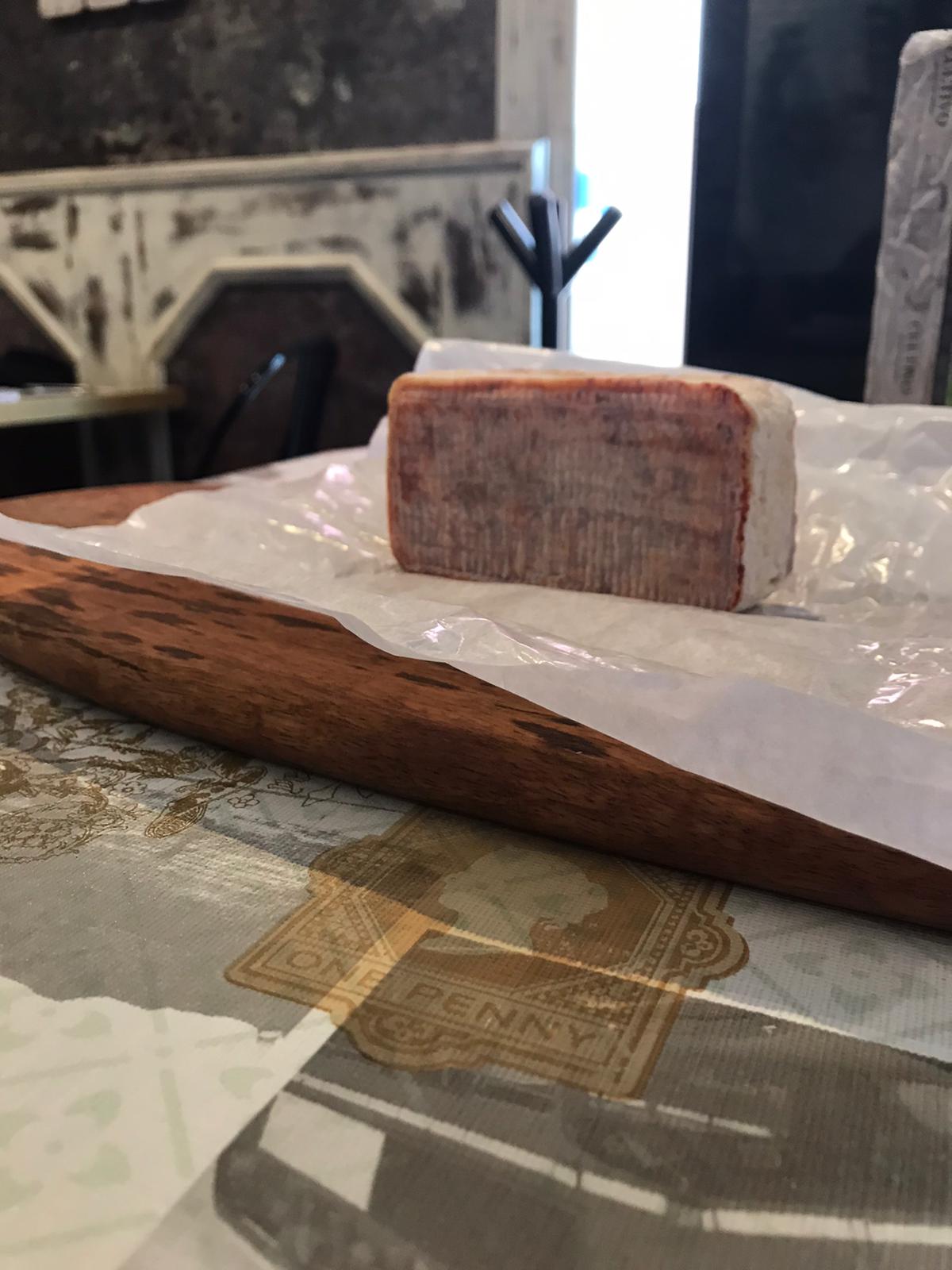 Queso láctico de leche cruda de cabra con 20 días de maduración. De textura sedosa y húmeda, aunque de pasta bastante compacta debido a la acción del Geotricum candidum que recubre toda su corteza. La cara superior está envuelta en pimentón, lo que aporta intensidad y un sabor interesante.